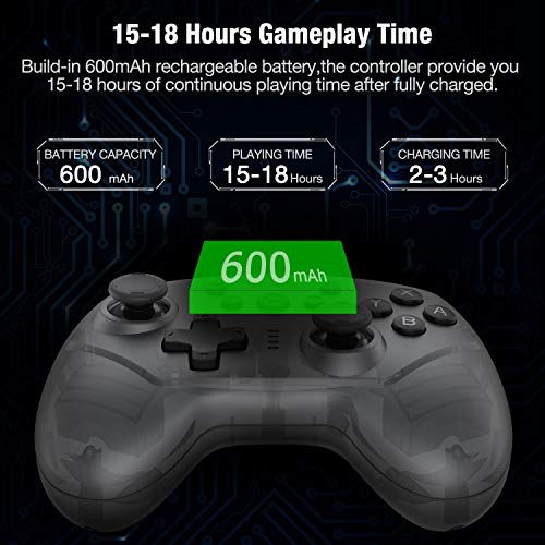 🎮 [ 15-18 Hours Gameplay Time ] Built-in 600mAh rechargeable battery, the controller provides you 15-18 hours of continuous play time after fully charged; and it will turn off to save power without working for 5 minutes. 3-year technical support, if you have questions for nintendo switch controller, feel free to let us know.